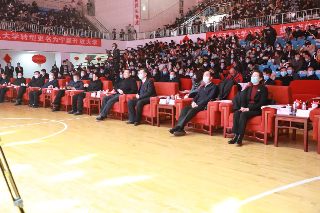 寧夏回族自治區人民政府副主席楊培君、國家開放大學副校長楊孝堂、自治區政府副秘書長吳濤、自治區黨委組織部部務委員宋弘陽、自治區黨委宣傳部二級巡視員李志強、自治區編辦副主任王棟、自治區教育廳副廳長張治榮、自治區財政廳副廳長楊冬梅、自治區農牧廳副廳長晁向陽、自治區民政廳副廳長方仲權、自治區發改委二級巡視員雷寧、自治區工信廳二級巡視員尹君、自治區科協副主席鄭明、自治區外事辦副主任張懷義、自治區商務廳對外經貿處處長李道勝、退役軍人事務廳就業創業處處長楊立山出席揭牌儀式。學校領導班子成員,電大離退休老領導和老教師代表,各基層電大負責人和學校師生代表以及部分新聞媒體參加揭牌儀式。儀式由校長劉煒主持。